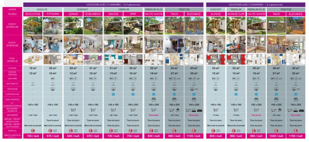 Wij bieden u maar liefst 14 verschillende huurmodellen aan. Van ingerichte tenten tot luxe stacaravans: u vindt zeker de perfecte huuraccommodatie voor uw vakantie in Thonon-les-Bains.